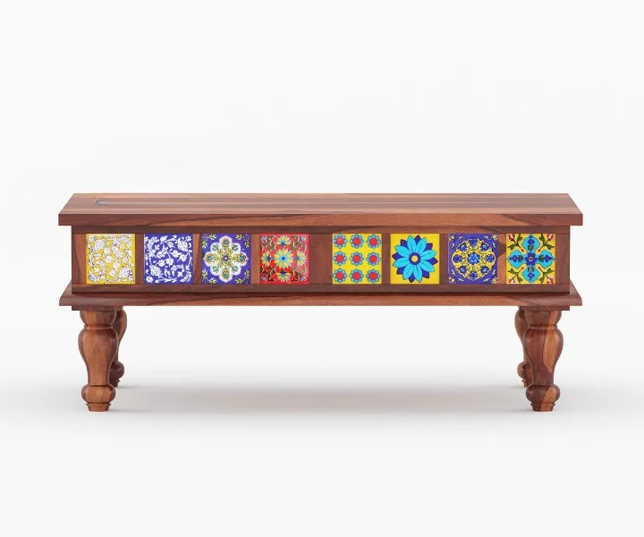 The Alyssa 6-Seater Dining Set is a unique dining set that perfectly embodies the Alyssa theme. The set includes a spacious table, four chairs, and a bench, all crafted from high-quality sheesham wood. What sets this dining set apart is its bohemian-inspired design, with intricate patterns and details that add a creative and playful touch. The table top features a beautiful finish highlighting the natural beauty of the wood, while the legs are painted in a pattern that immediately catches the eye. This is perfect for those who love to mix and match styles and textures, creating a unique and eclectic look that is both playful and sophisticated. The Alyssa theme is all about embracing individuality and self-expression, and this dining set does just that with its colors, intricate patterns, and stunning craftsmanship.