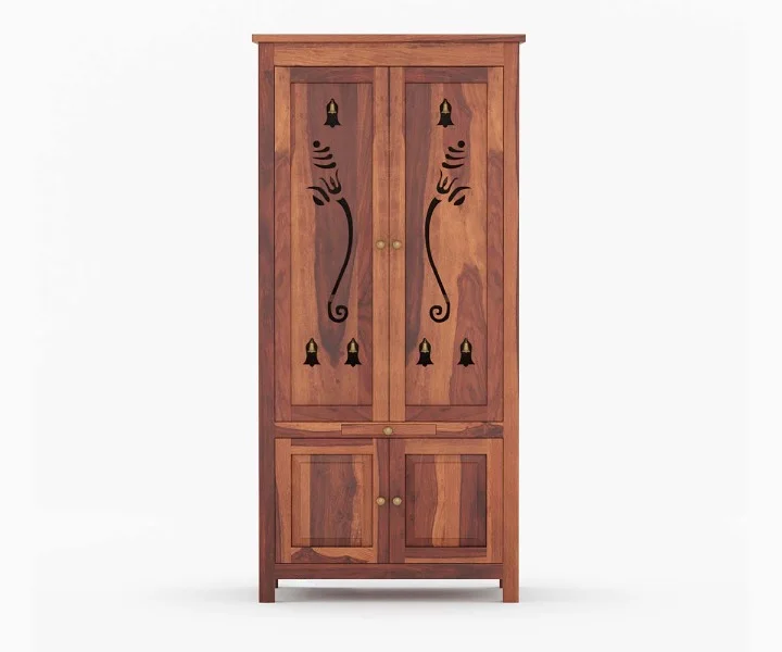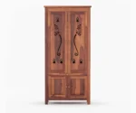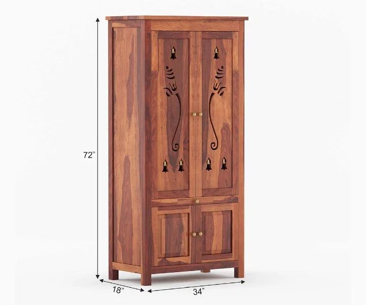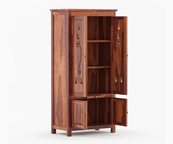 1.Anjaneya is a traditional design of a home temple. The top of the unit is made in a triple layer with a small dome-like pattern at various spots. It has two doors in front, which are further indented with curio design. A pull-out tray and a drawer follow the temple. Legs are carved with curly brackets at the inverted sides.