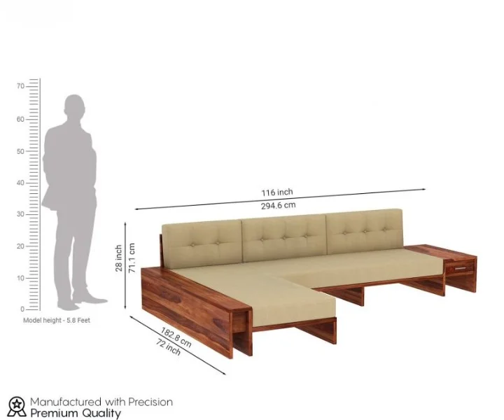 Product Features: Cortez L-shaped wooden sofa set is a well engineered piece of art. It has empty space at bottom so you could lift the sofa, and could move it anywhere effortlessly. Furthermore, it allows you to clean under the empty space at its feet and doesn’t give chance to let the debris accumulate under it. Besides this, the sofa set has a storage unit at the end of one of its arms. It is spacious, and on top of it has a pleasing design.