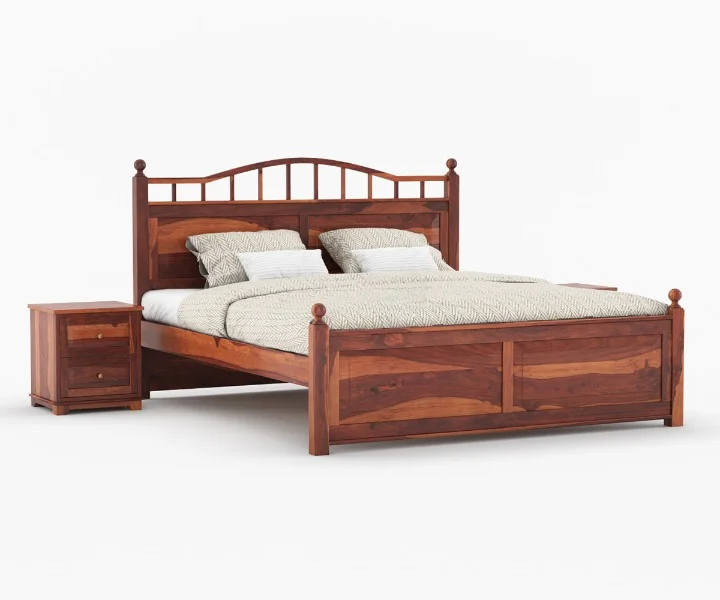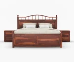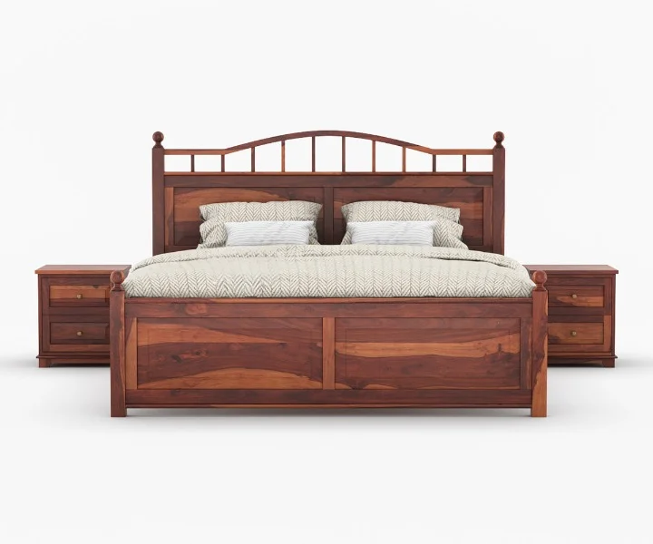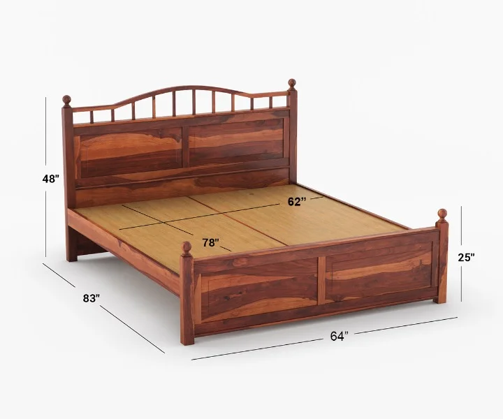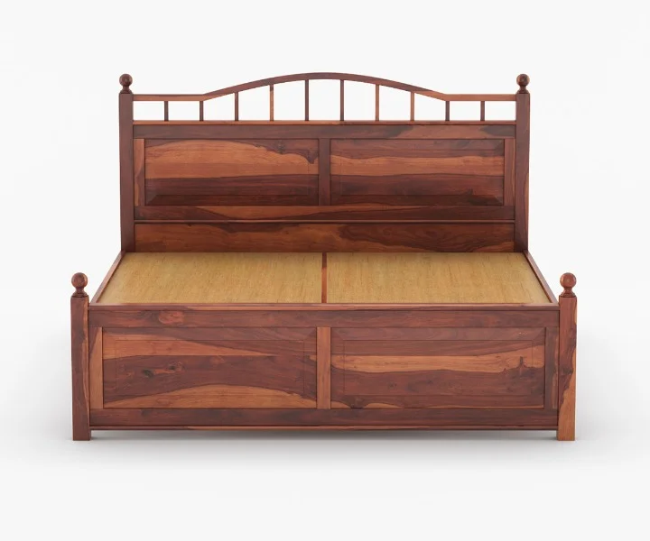 This bed is expertly crafted using premium-quality material, ensuring a robust and long-lasting build. The bed showcases an elegant teak finish with brass inlay accents, adding a touch of sophistication to its overall appearance.