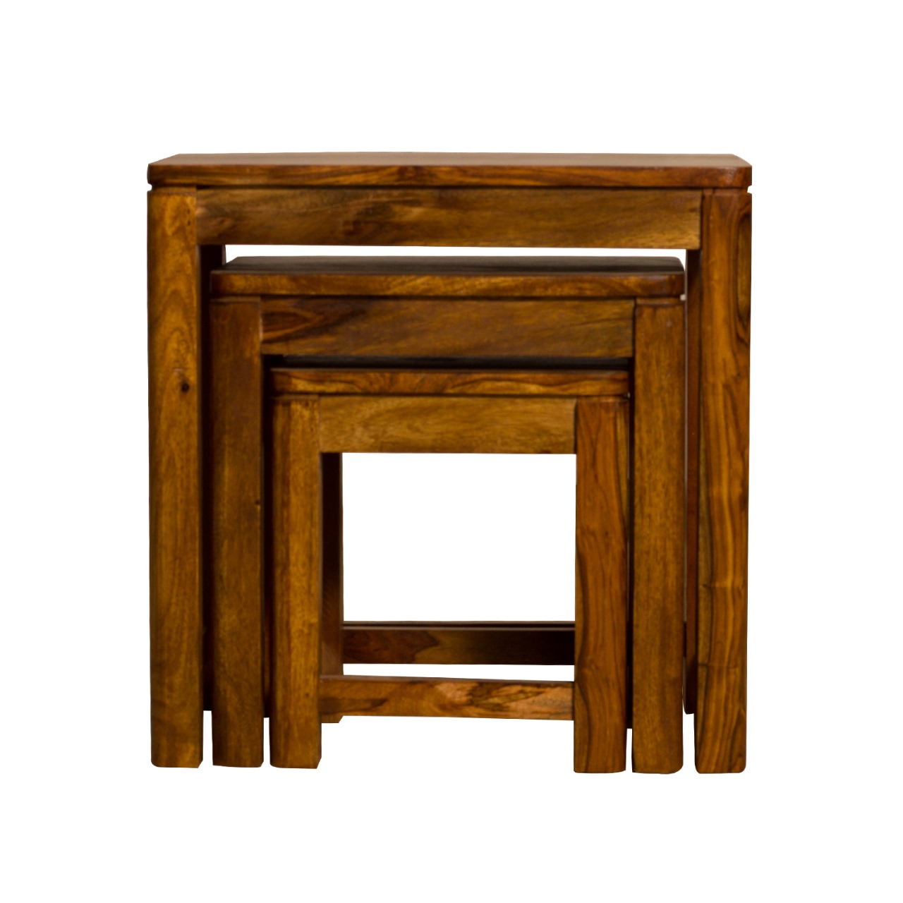 Key features: Solid Sheesham wood construction; set of 3 nesting tables; warm honey finish; compact footprint; versatile multi-room use.