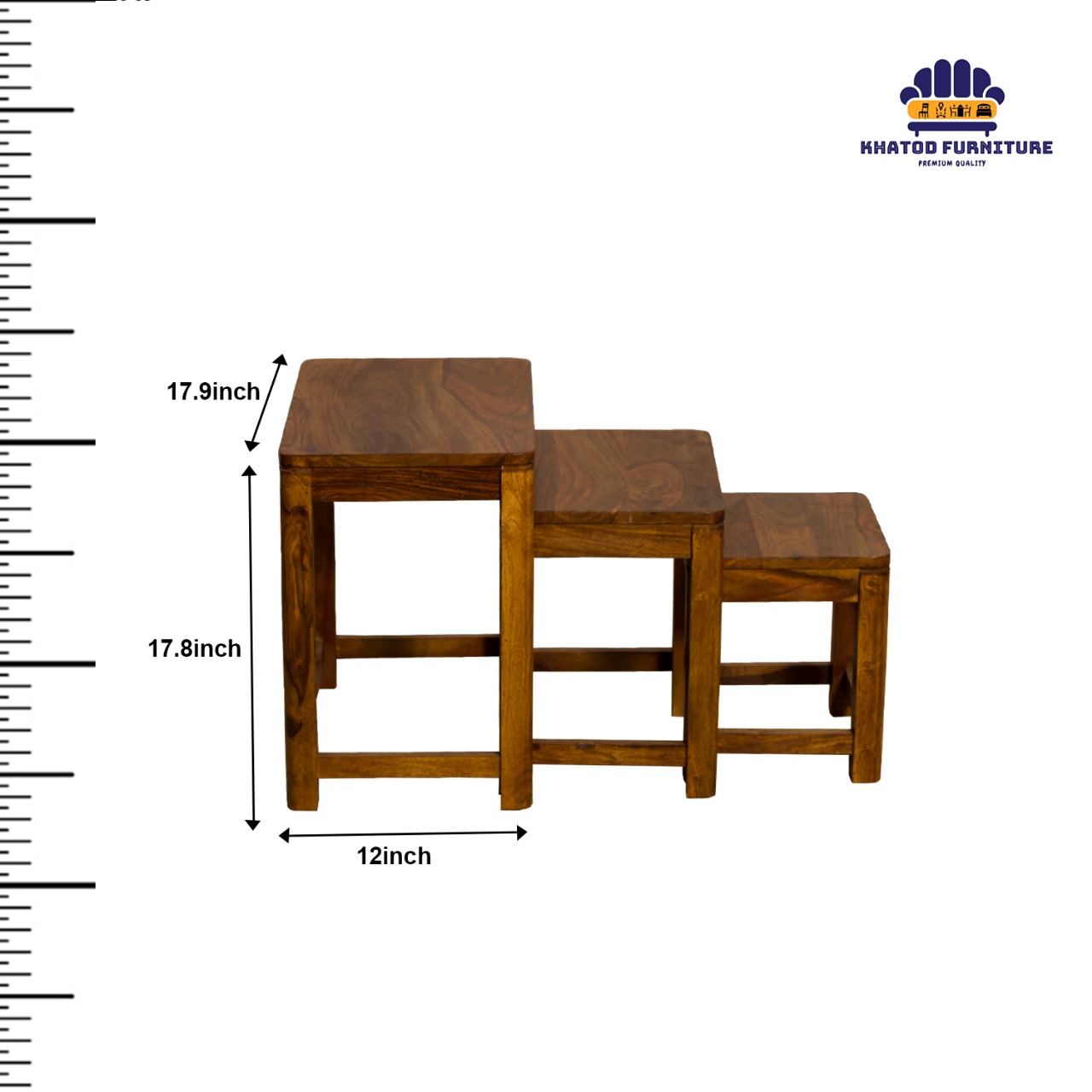 The largest table stands approximately 17.9 inches high with a 12 inch depth (front to back), making it perfect as a compact side table beside a sofa or accent chair. The two smaller tables set are proportionally scaled to fit underneath, ideal for serving guests, holding snacks and drinks, or displaying décor such as lamps, books, and plants. The sturdy hardwood frame and thick top panels provide reliable load-bearing capacity, ensuring that these nesting tables set can handle everyday use with ease.
