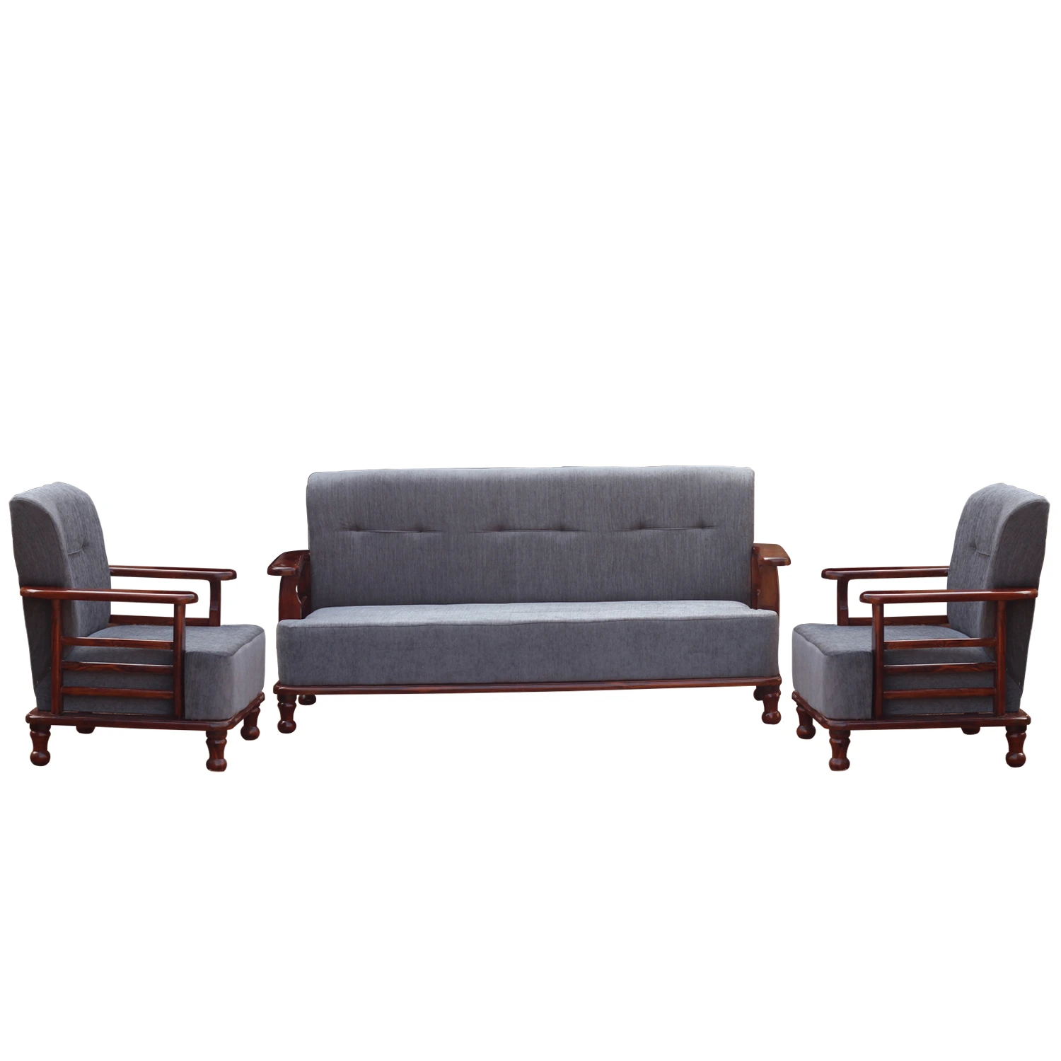 This premium 5 seater sofa chair combines a solid wood frame with plush cushioning to create a compact yet comfortable seating solution for living rooms, bedrooms, offices, and lounge areas. The sturdy wooden structure is finished in a rich warm tone, highlighting the natural grain and adding a timeless, classic touch to any décor theme from traditional to modern. Thick grey upholstered seat and back cushions provide generous comfort and support, making this wooden armchair ideal for long conversations, TV time, or reading sessions.