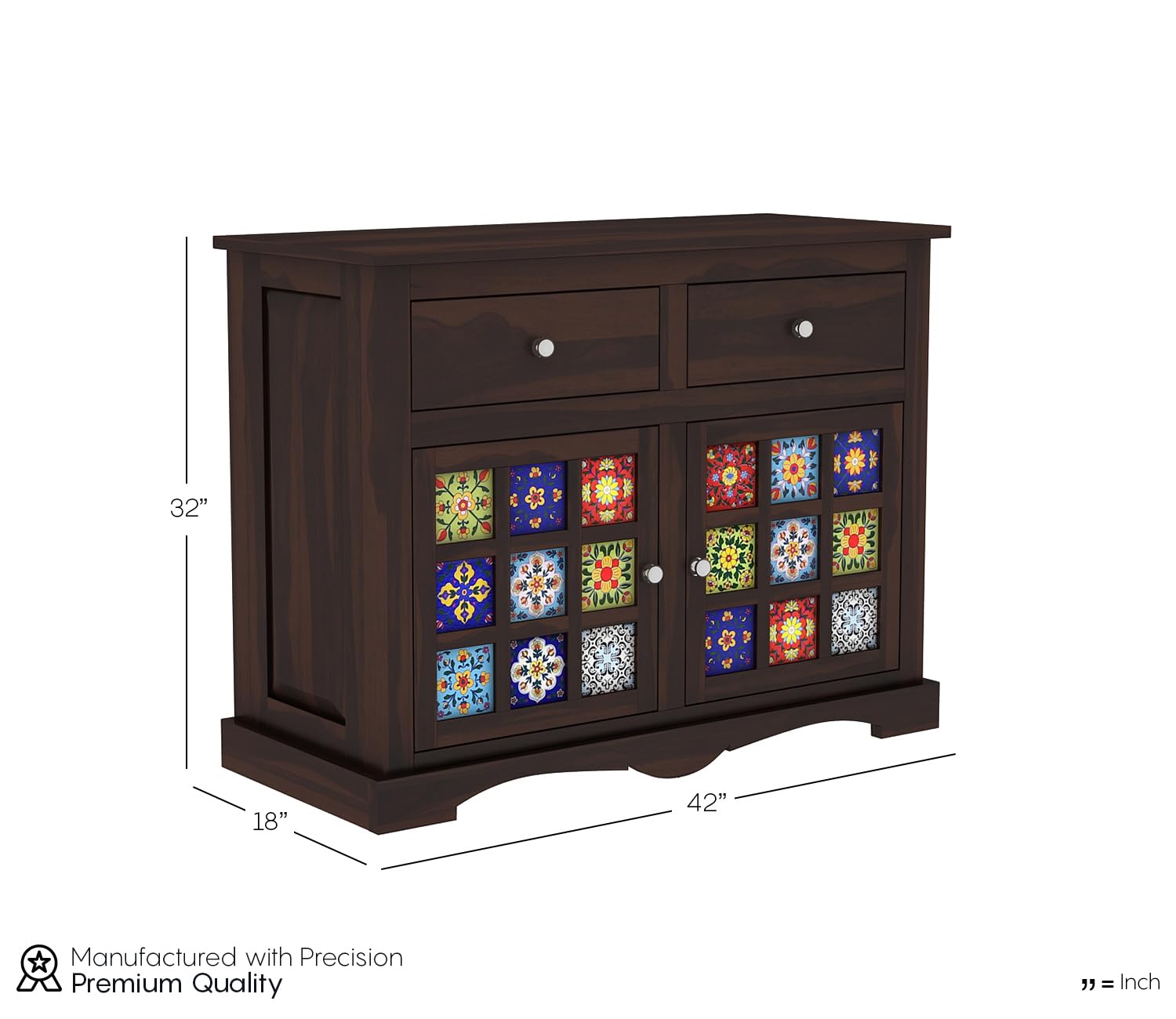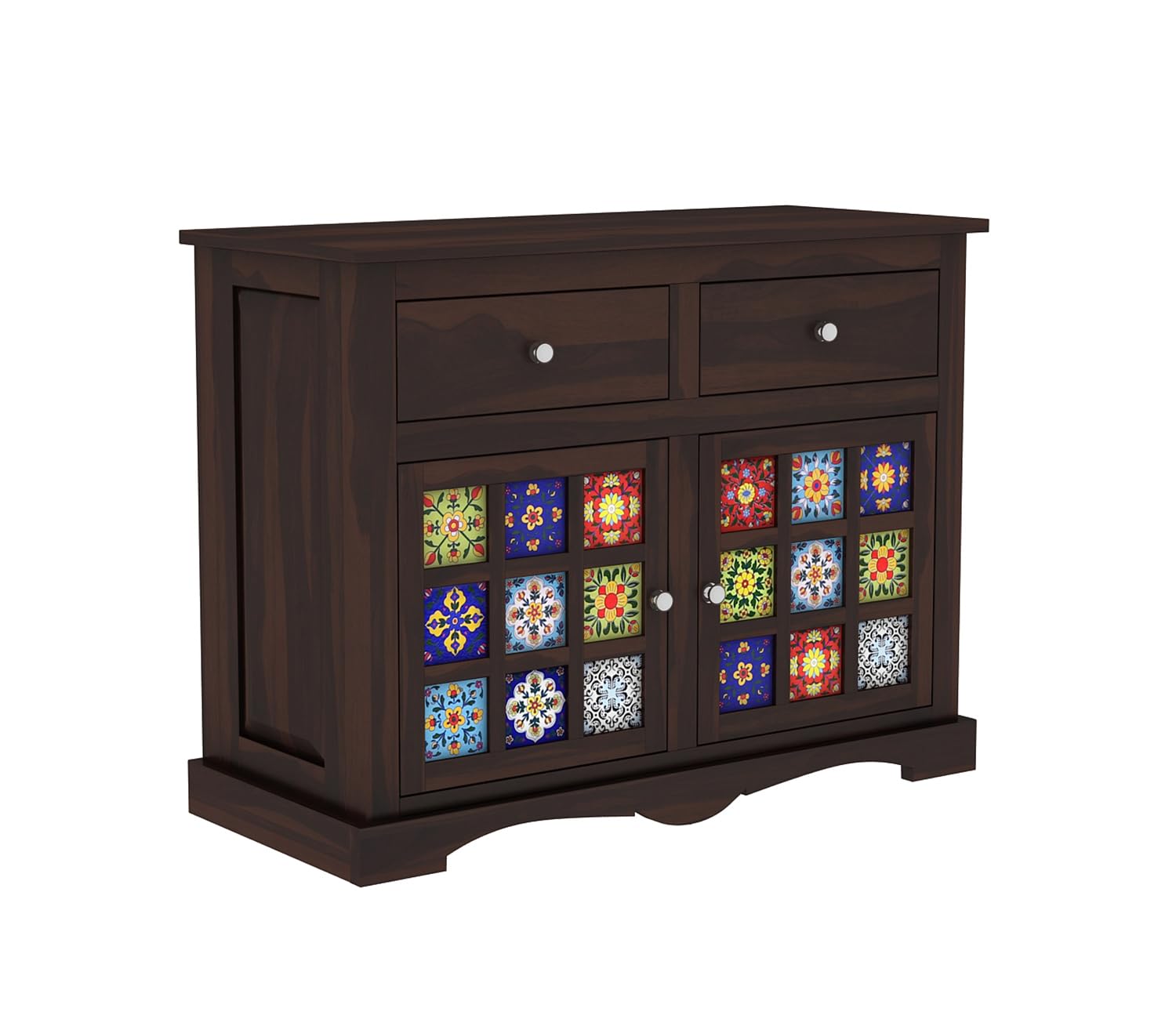 • Key features: Solid Sheesham wood body; 2 drawers; 2-door cabinet with internal shelf; multi-color ceramic tile front; dark walnut-style finish.