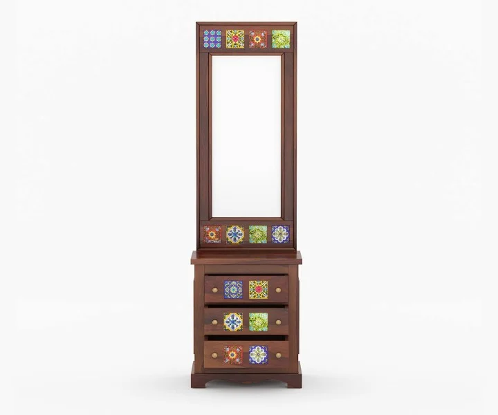 This  dressing table is decorated with colourfull designs inspired by the bohemian culture. With a slender and tall mirror frame, this dressing table is equipped with storage at the bottom, in the form of three drawers and a counter-top.