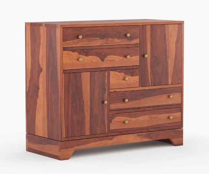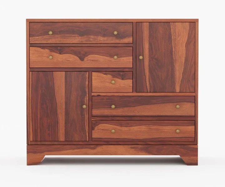 The chest has a contemporary yet timeless appeal, making it versatile for various interior settings. The warm honey finish, combined with the minimalist brass hardware, creates an elegant piece that adds both style and functionality to any room. The varying drawer sizes and cabinet doors provide flexible storage solutions, making this chest a practical addition to a living room, bedroom, or hallway.