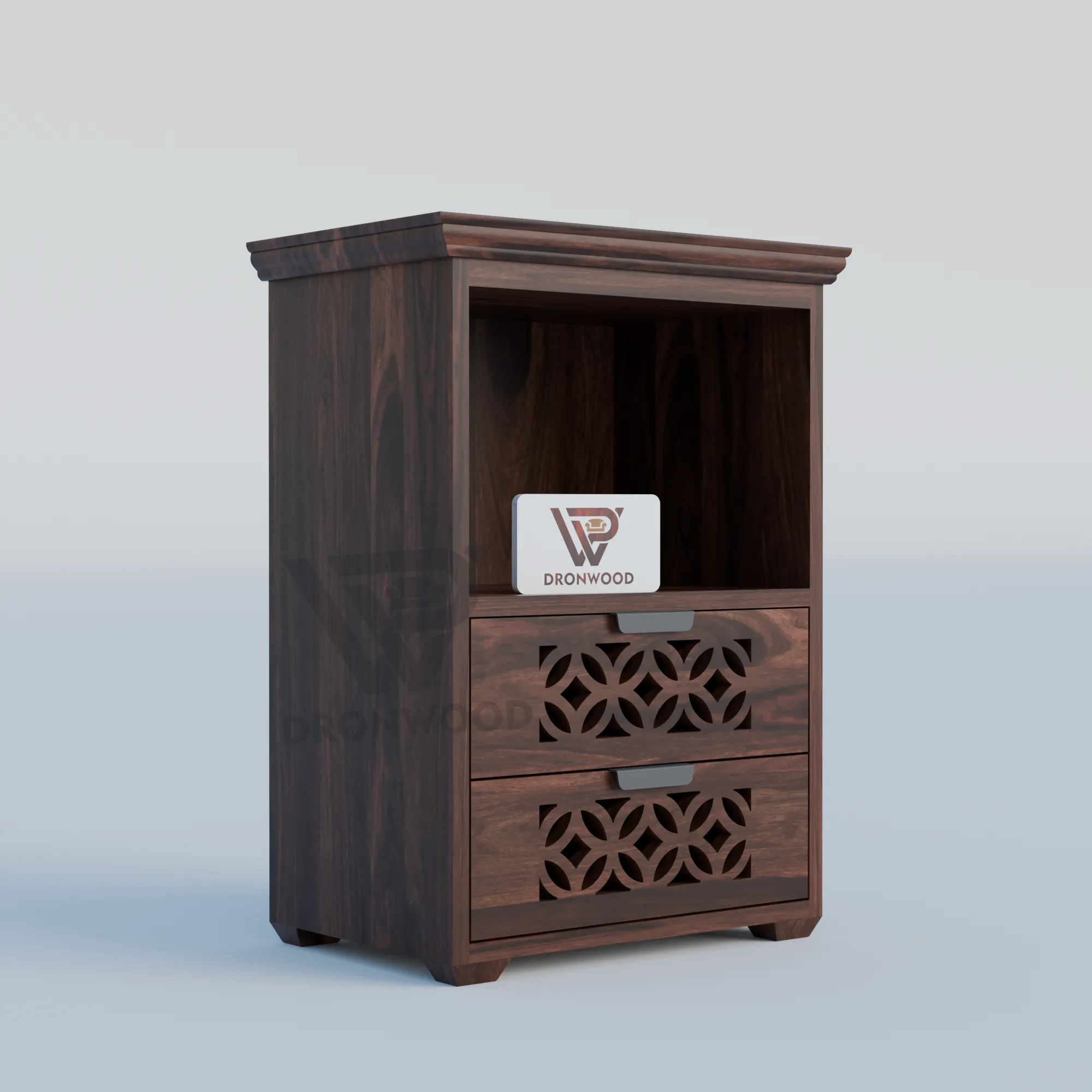 • Key features: Solid Sheesham wood construction; CNC-carved 2-drawer front; open middle shelf; molded top; dark walnut-style finish.