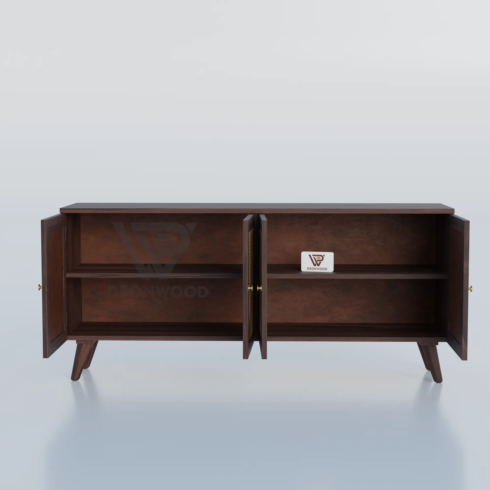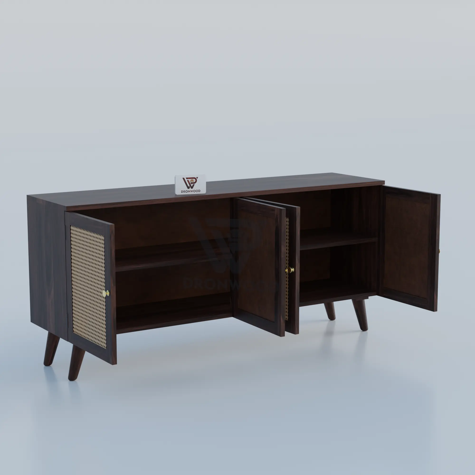 Key features: Solid Sheesham wood cane sideboard construction; 4 cane-panel doors; adjustable or fixed internal shelving; tapered mid‑century legs; rich dark finish.