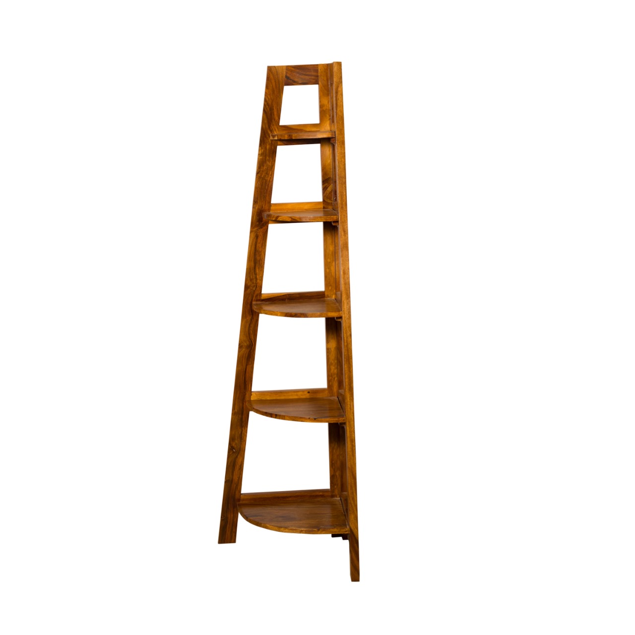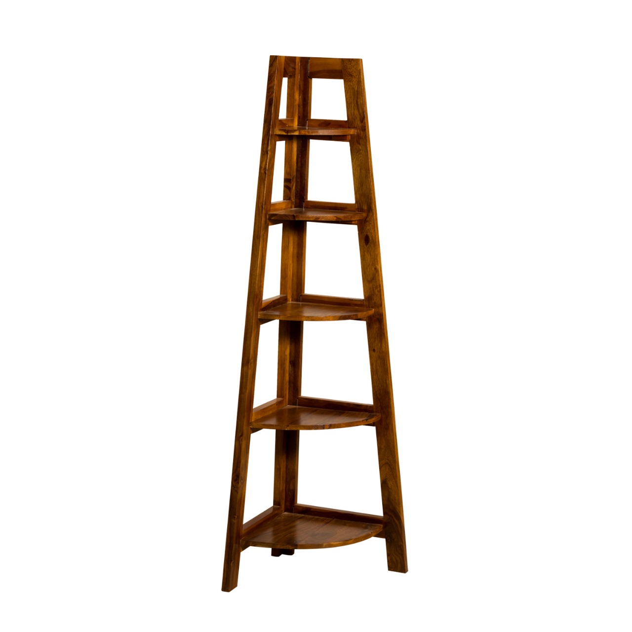 Key features: Solid Sheesham wood construction; 5 open triangular shelves; ladder-style tapered frame; warm honey finish.
