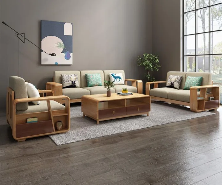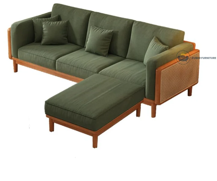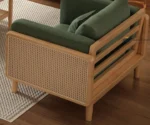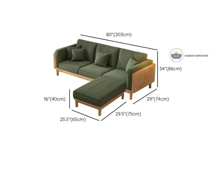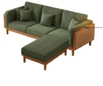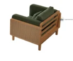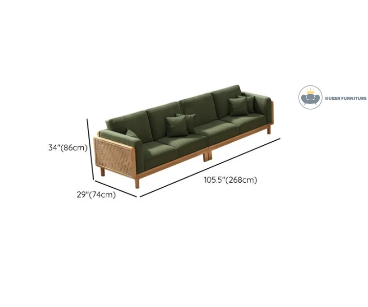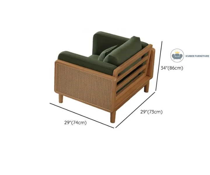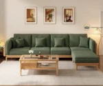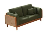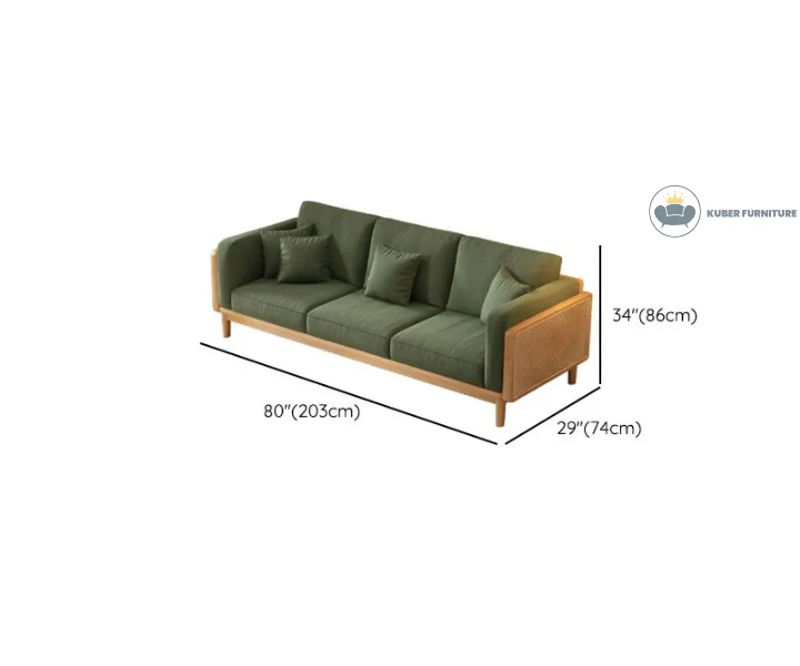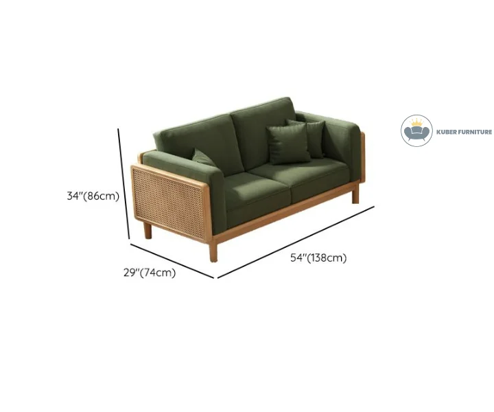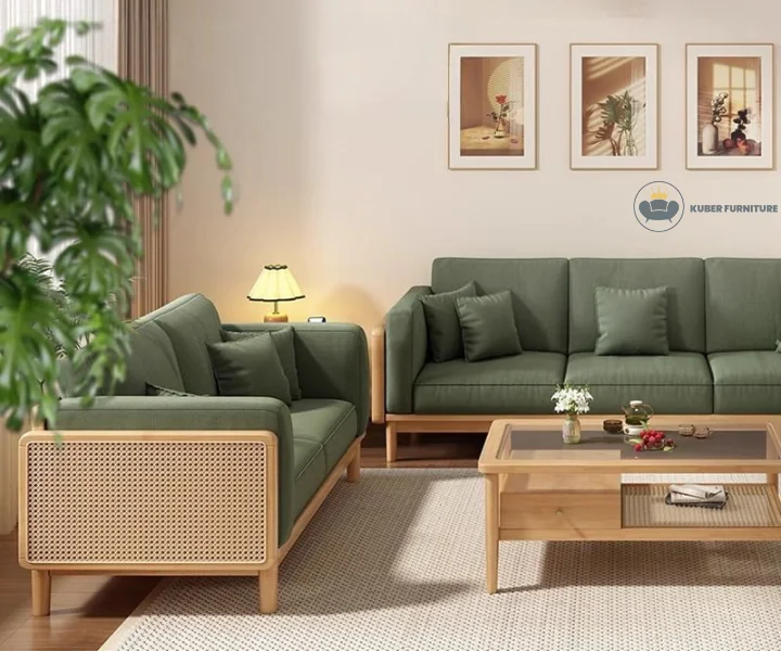 The sturdy wooden base supports plush jade green cushions, creating a perfect harmony between style and comfort. Tapered wooden legs elevate the structure, offering both durability and a light, airy feel to the room. Ideal for cozy conversations and stylish lounging, this sofa set embodies timeless grace and earthy elegance.