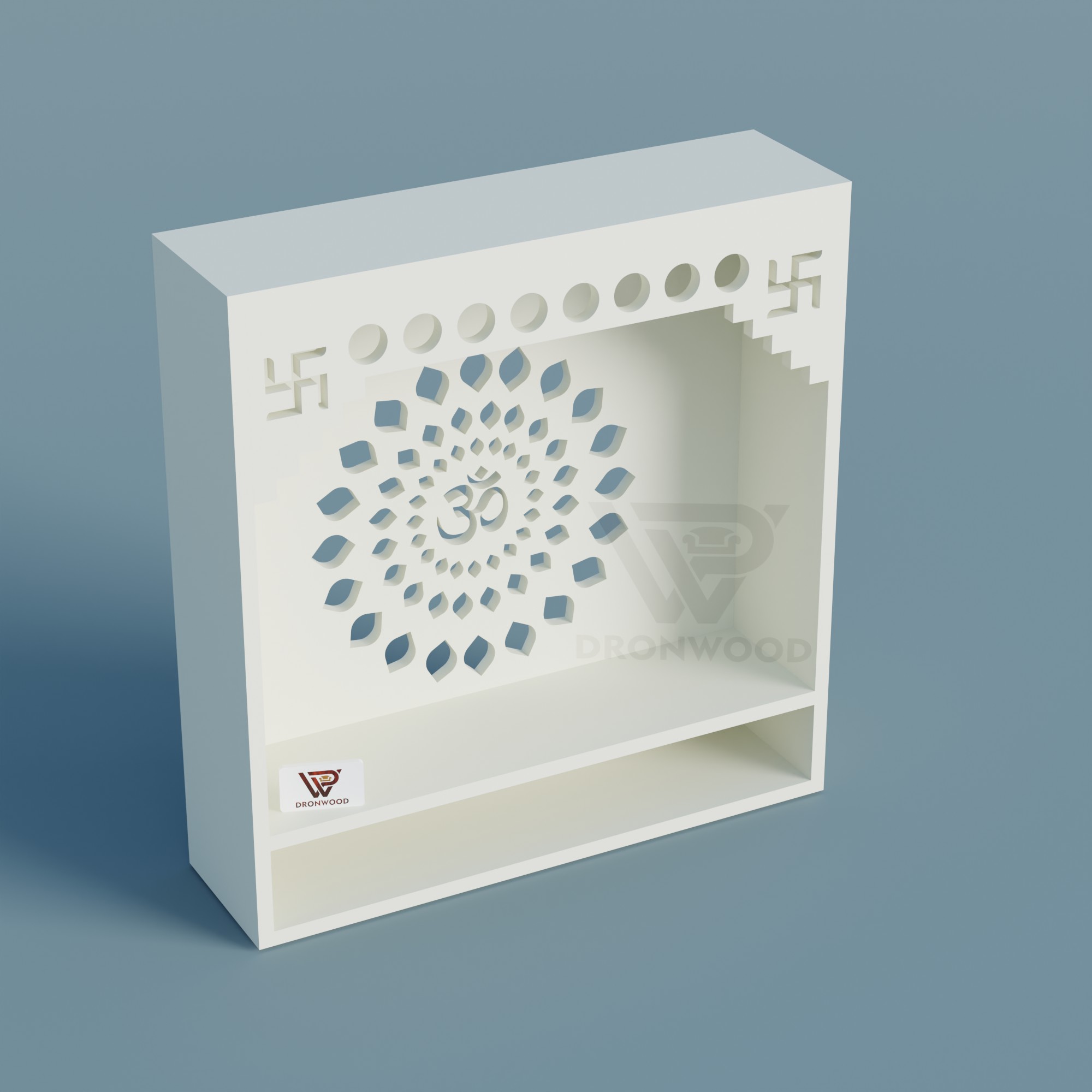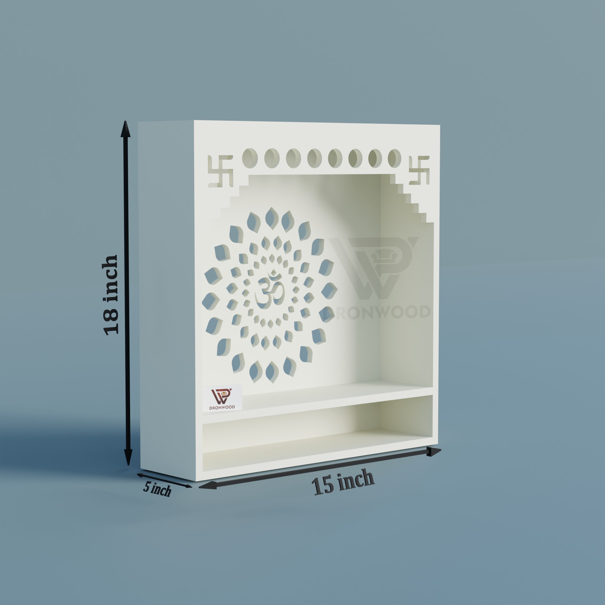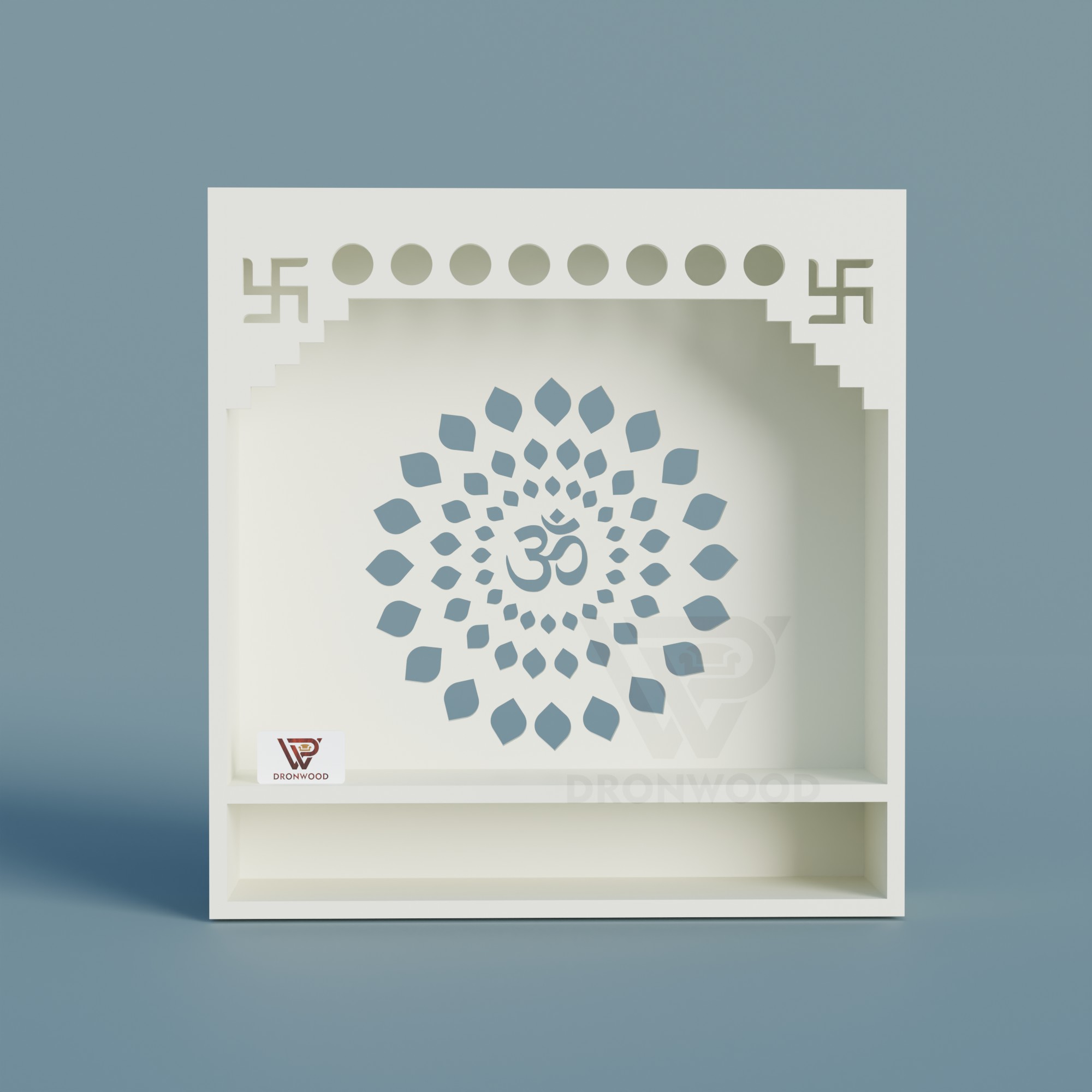 Key features: Wall-mounted puja unit; CNC Om and traditional symbols; open bottom shelf; matte white finish; compact depth.